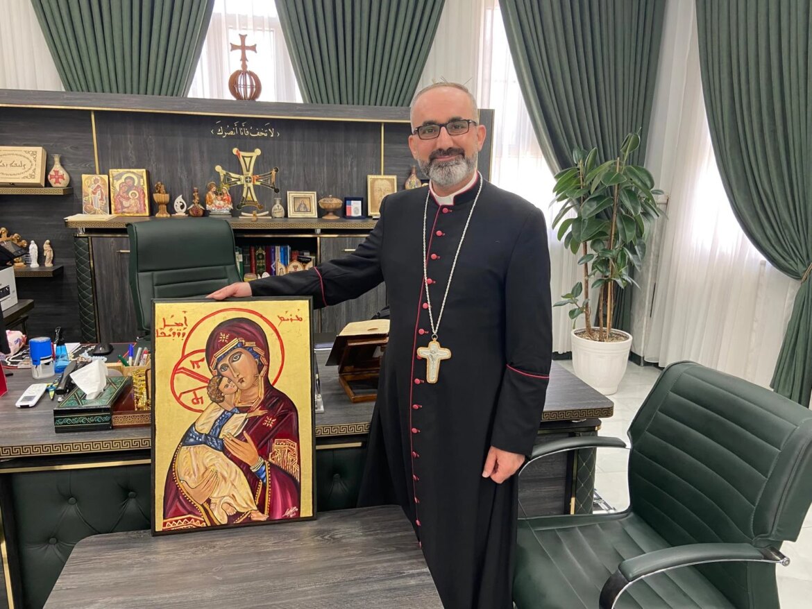 English priest presents Our Lady of Persecuted Christians icon to Iraqi bishop