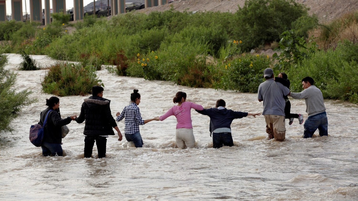 Asylum seeking migrants stand in the rain before being transported to a U.S. Border Patrol processing center